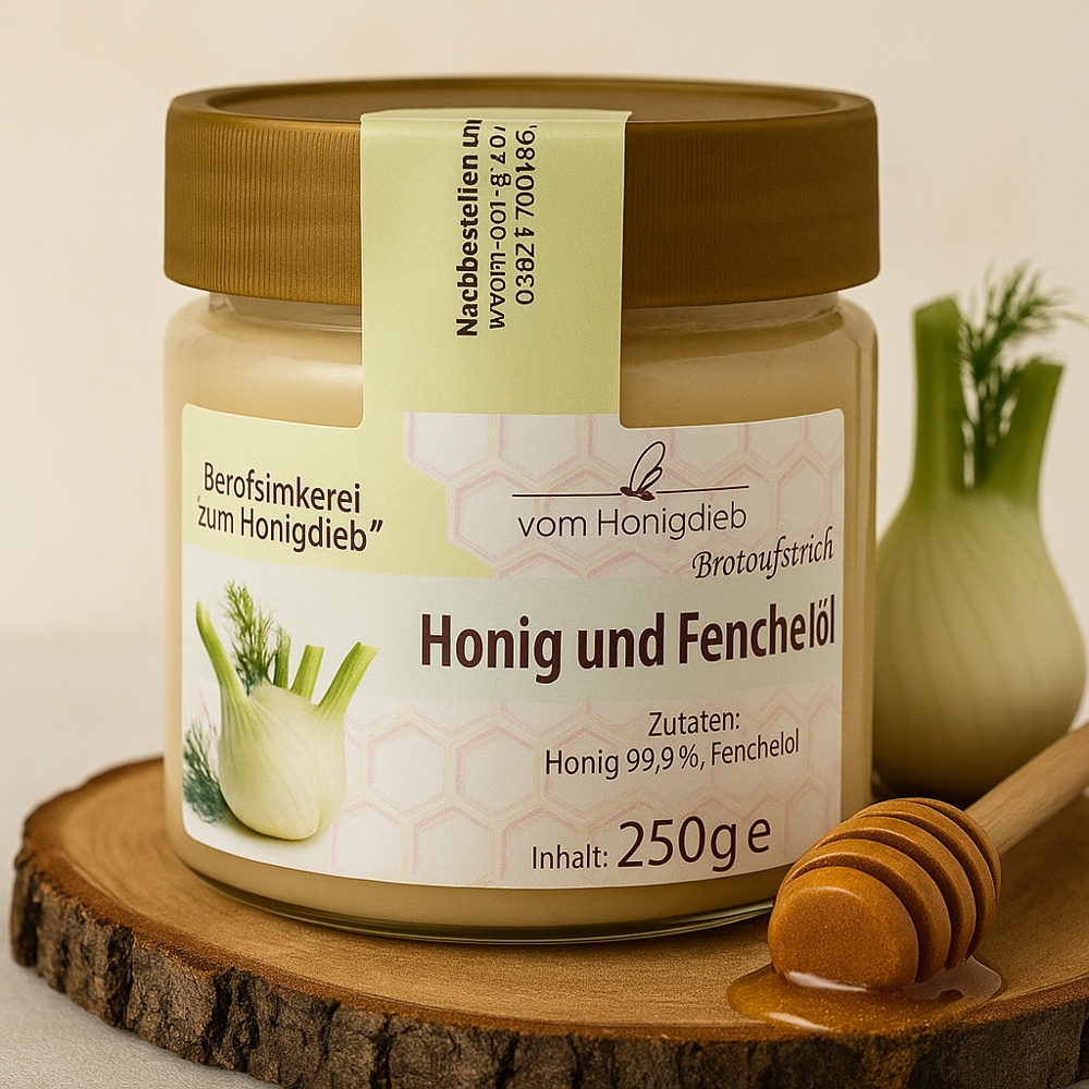 Honig und Fenchelöl ist ein cremiger Honig-Brotaufstrich auf Basis eines milden Blütenhonigs, verfeinert mit einem Hauch ätherischem Fenchelöl. Das Ergebnis: ein angenehm weicher, aromatischer Geschmack mit typischer Fenchelnote – ideal für Frühstück, Tee oder einfach pur.